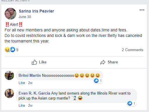 Another victim of the pandemic lockdown is the Redneck Fishing Tournament out of Bath, IL. People on Facebook grieved the tournament being canceled.